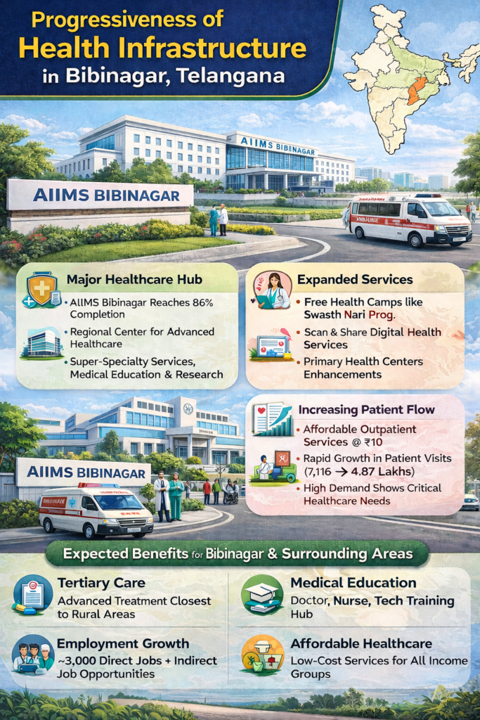 The health infrastructure in Bibinagar, Telangana is experiencing unprecedented transformation โ anchored by the AIIMS Bibinagar project and complemented by community health initiatives and modern digital services. From enhanced tertiary care and medical education to inclusive outreach programmes, Bibinagar is steadily becoming a regional health services hub that elevates both access and quality of care for people in Telangana and neighboring regions.