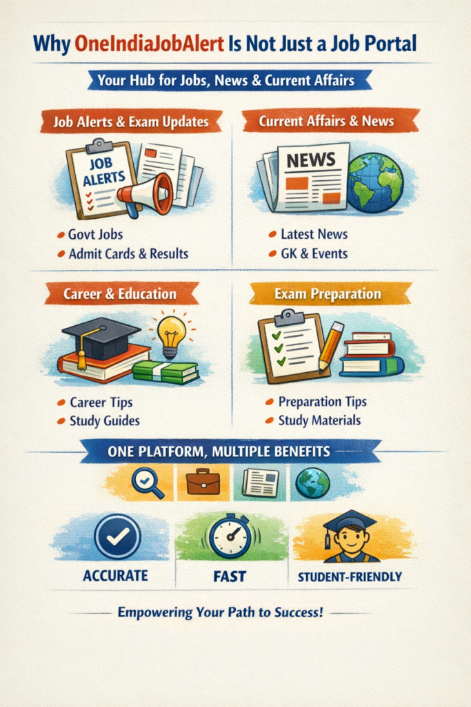 Updates OneIndiaJobAlert provides:Latest government job Notification admit card, answer key, and result Update exam schedules and official Notice detailed information sourced only from official Authorities current Affairs & News That Matter success in competitive exams depends heavily on current affairs. Our platform covers:National and state-level current Affairs government schemes and policy Update important events related to education, employment, and public Welfare news relevant for UPSC, SSC, Banking, Railways, State PSCs, and other Exams education & Career-Focused Content We aim to guide users beyond exams by sharing:Career guidance Article educational news and policy Changes recruitment trends and Insights exam preparation tips and awareness Article trusted, Fast & Student-Friendly OneIndiaJobAlert is built on three strong pillars:Accuracy – Only verified and official Information speed – Timely updates without Delay simplicity – Easy-to-understand language for every Aspirant one Platform, Multiple Benefits instead of visiting multiple websites for jobs, results, news, and current affairs, users can rely on OneIndiaJobAlert as a single trusted destination.Our Mission our mission is to empower India’s youth with authentic information, helping them make informed decisions in their academic and professional journey.OneIndiaJobAlert is not just a job portal — it is your daily companion for jobs, news, current affairs, and career growth.